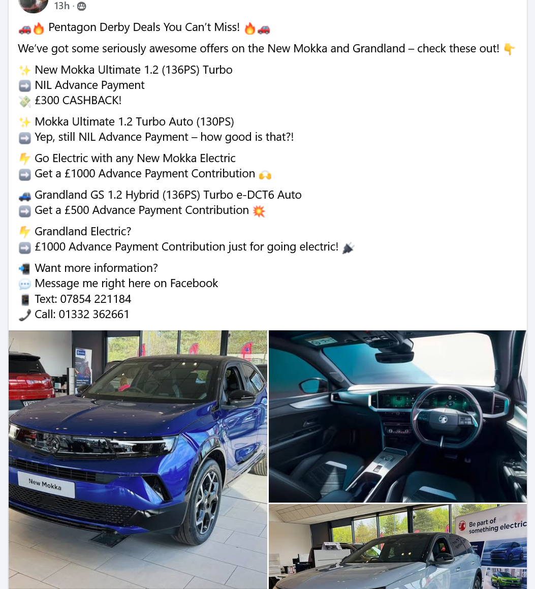 Via the usual fb groups posted yesterday 15th April 25, Pentagon Vauxhall in Derby are offering dealership AP contributions/cashback on selected Vauxhall Mokka and Grandland models. See ad below for details. Dealership contact is Heather.