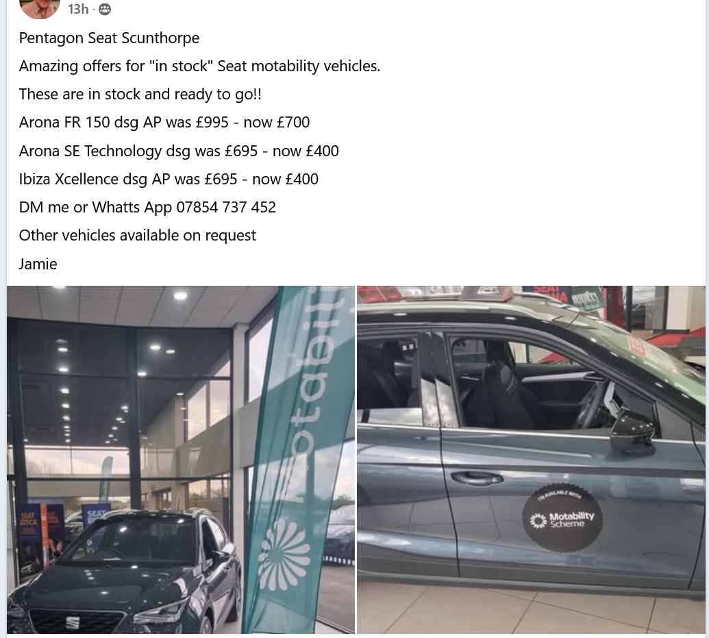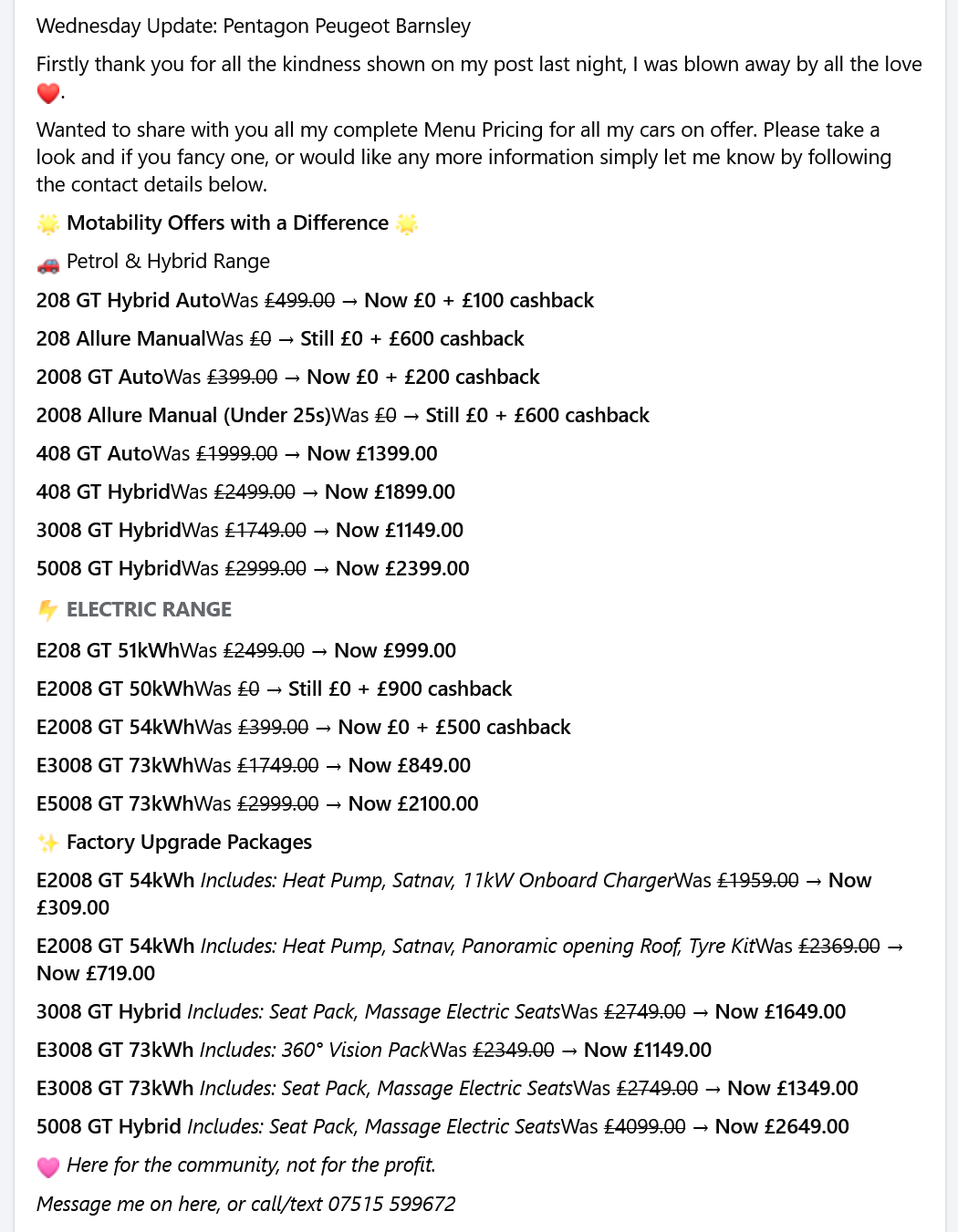 Via the usual fb groups posted today 16th April 25, and further to previously posted offers from this dealership, Pentagon Peugeot in Barnsley, South Yorkshire have added a new section to their posted Motability offers entitled ‘Factory Upgrade Packages’. Full current dealership offers as listed below. Dealership contact is Tim.