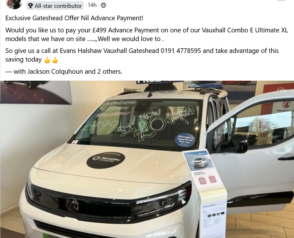Via the usual fb groups, posted yesterday 15th April 25, Evans Halshaw Vauxhall in Gateshead, Tyne & Wear are offering to cover the £450 AP on stock Vauxhall Combo E Ultimate XL models: