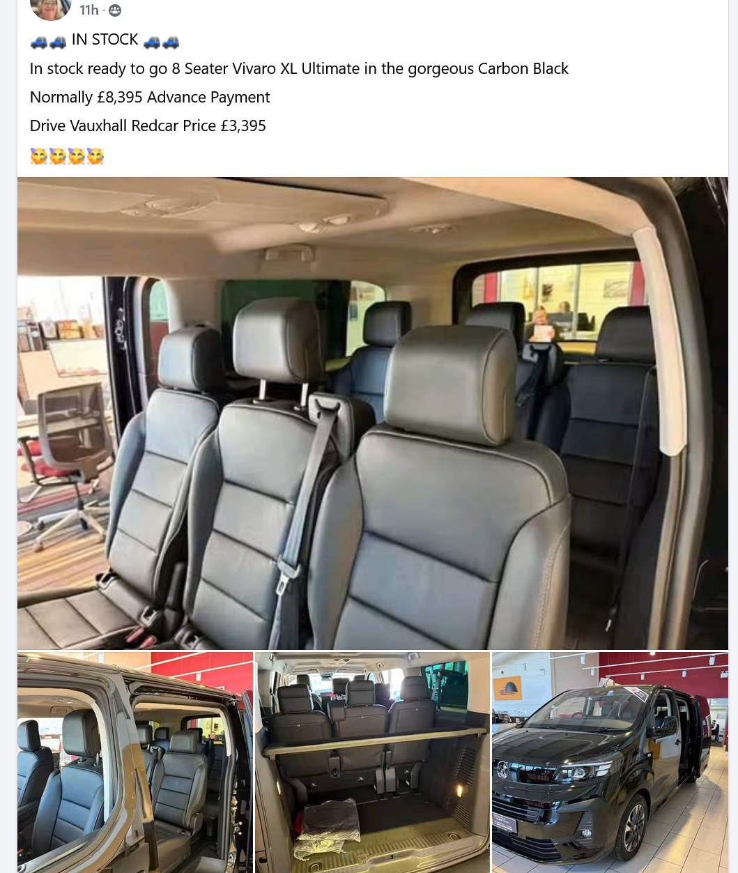 Via the usual fb grups posted yesterday evening 15th April 2025, Drive Retail Vauxhall in Redcar, Teesside are offering one stock Vauxhall Vivaro Ultimate XL 8-seats with £5000 off the AP (Normal AP £8395, now £3395). One Only.