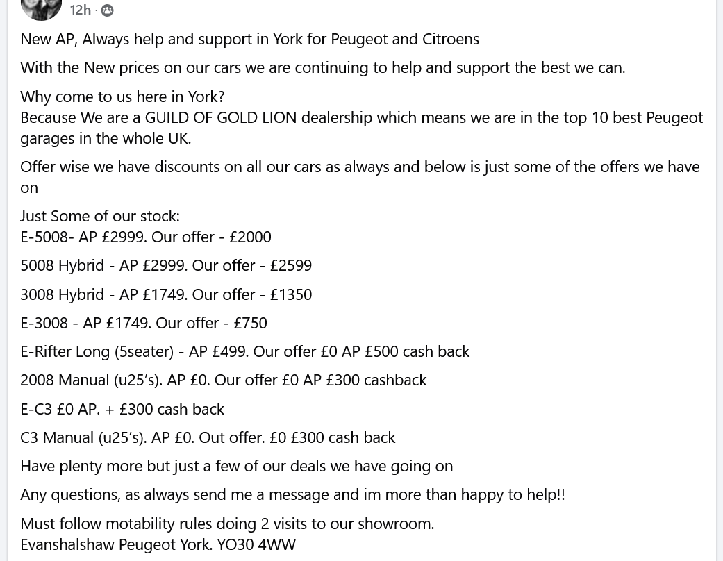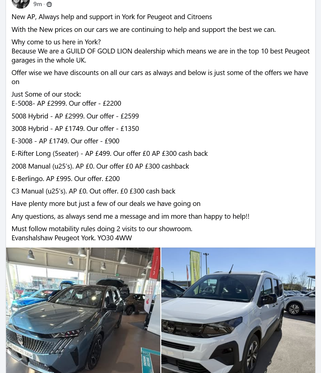Via the usual fb groups, posted today 16th April 2025, and fiurther to previously posted offers at this dealership, Evans Halshaw Peugeot & Citroen in York have revised their Motability offers as listed below. Dealership contact is Liam: