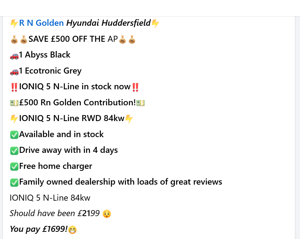 Via the usual fb groups, posted a few minutes ago today 16th April 2025, RN Golden Hyundai in Huddersfield, West Yorkshire are offering a £500 dealership contribution off the AP on two stock Hyundai Ioniq 5 N Line models: