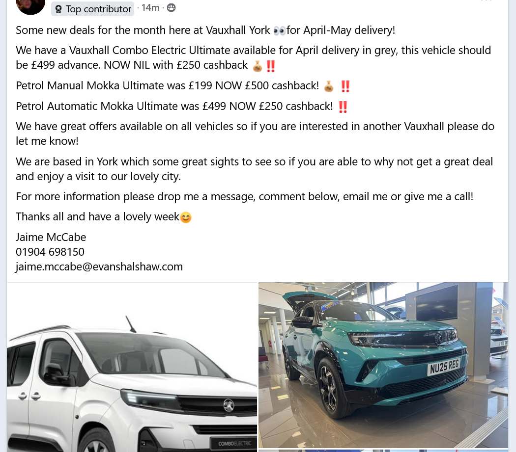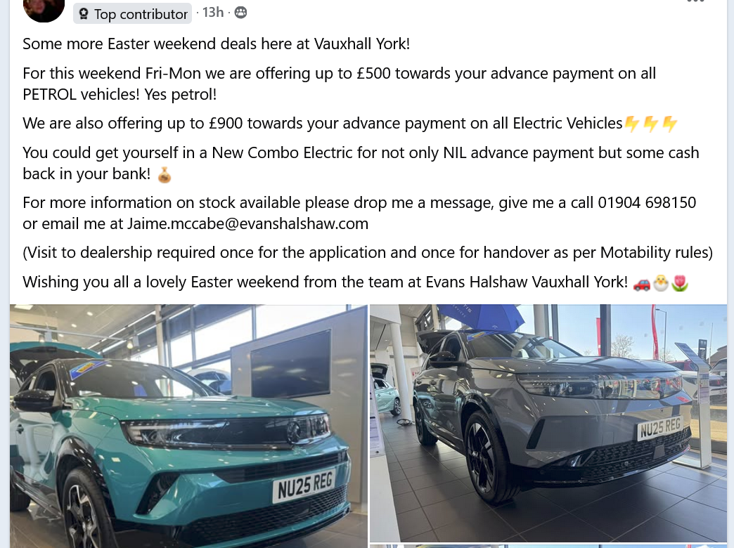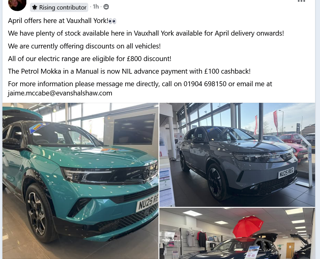 Via the usual fb groups posted today 16th April 25, and further to previously posted offer from this dealership, Evans Halshaw Vauxhall in York are still offering £800 off the AP of any stock Vauxhall EV and also Nil AP with £100 cashback on stock Mokka petrol manual: