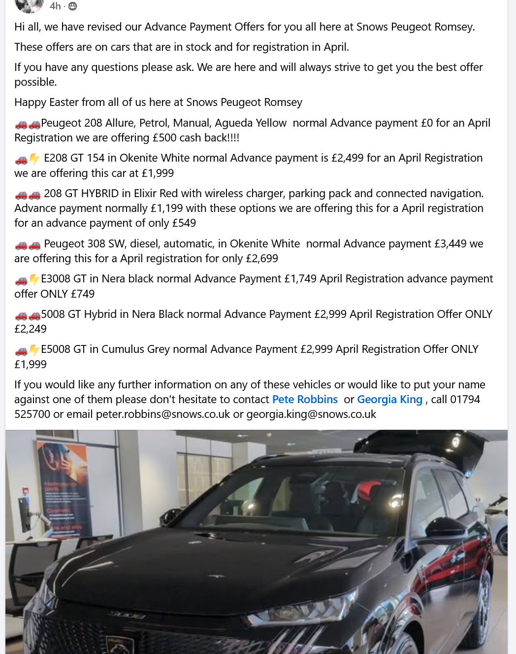 Via the usual fb groups posted today 17th April 25, Snows Peugeot in Romsey Hampshire have revised their offers to those previously posted, as now detailed below. For registration/delivery in April 25: