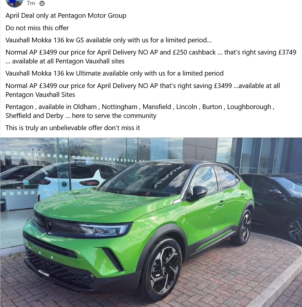 Via the usual fb groups posted today 17th April 25, Pentagon Vauxhall in Oldham, Nottingham, Mansfield , Lincoln, Burton, Loughborough, Sheffield and Derby are offering £3499 off the AP of the Vauxhall Mokka EV (making it nil AP) plus giving £250 cashback on the GS model ‘for a limited period’. All for April 2025 delivery: