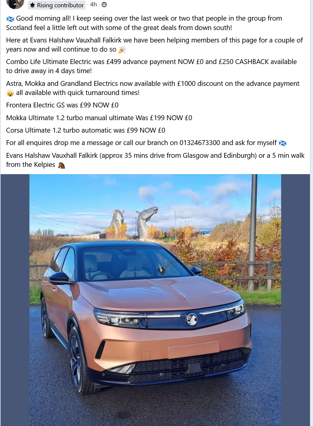 From the usual fb groups posted today 17th April 25, Evans Halshaw Vauxhall in Falkirk, Scotland are offering various AP discounts/cashback as detailed below . Dealership contact is Daniel.