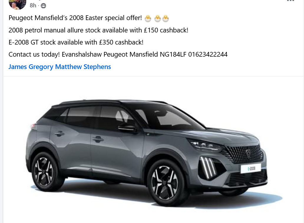 Via the usual fb groups posted yesterday 17th April 25, Evans Halshaw Peugeot in Mansfield, Notts are offering £150 cashback on the Peugeot 2008 Allure manual. The E2008 GT also with £350 cashback: