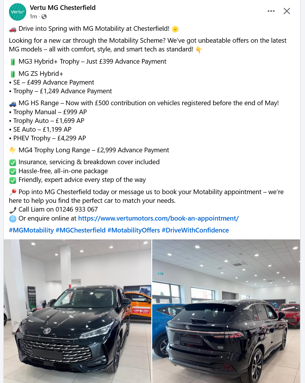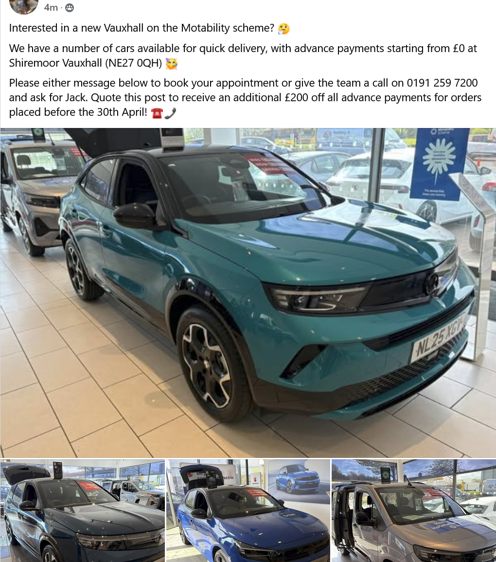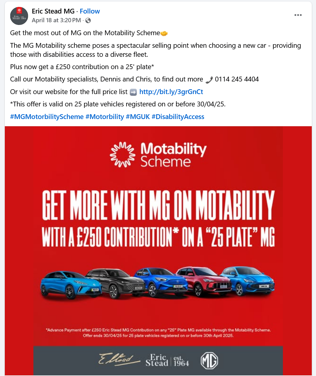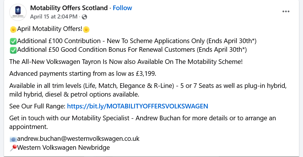 Via the usual fb groups, posted 15th April 25, Western Volkswagen in Newbridge, Edinburgh are offering £100 AP contribution to ‘new to scheme’ Motability customers, and an ‘Additional £50 GCB’ to returning customers. Ends 30th April 2025: