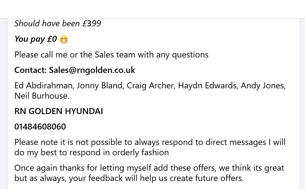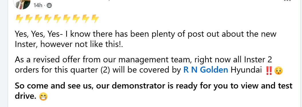 Via thew usual fb groups posted yesterday afternoon 18th April 25, and further to the previously posted offer at this dealership, RN Golden Hyundai in Huddersfield, West Yorkshire are now offering the Hyundai Inster 2 with nil AP (normally £399) during Q2 2025 (ie until 30th June 25):