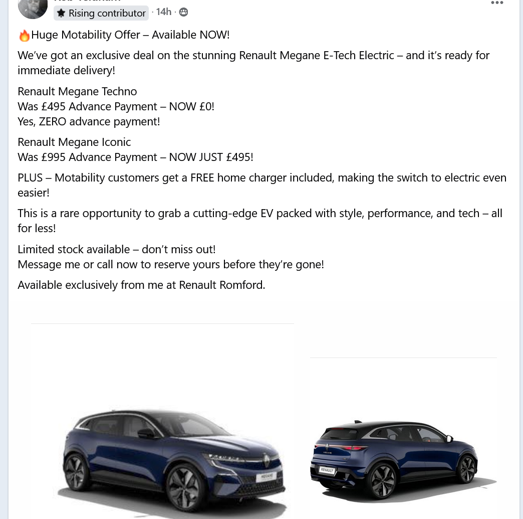 Via the usual fb groups posted yesterday afternoon 18th April 25, Renault Retail Group in Romford are offering a limited stock of the Renault Megane Techno for Nil AP (normally £495) and limited stock Megane Iconic for £495 AP (normally £995). Whilst stocks last.