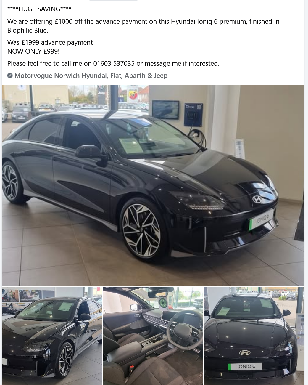Via the usual fb groups posted within the past 30 minutes today 21st April 25, Motorvogue Hyundai in Norwich are offering a dealership contribution of £1000 off the AP of one only stock Hyundai Ioniq 6 Premium in blue. Dealership contact is Sean: