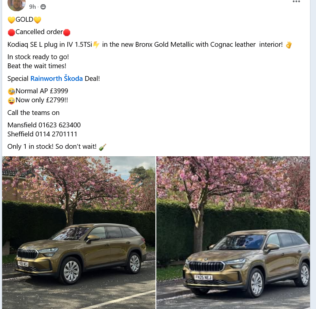 Via the usual fb groups posted yesterday evening 22nd April 25, Rainworth Skoda in Mansfield/Sheffield are offering one stock Skoda Kodiaq SE L PHEV 1.5 TSI with an AP contribution of £1200 (so AP now £2799 instead of £3999). One stock model only in gold: