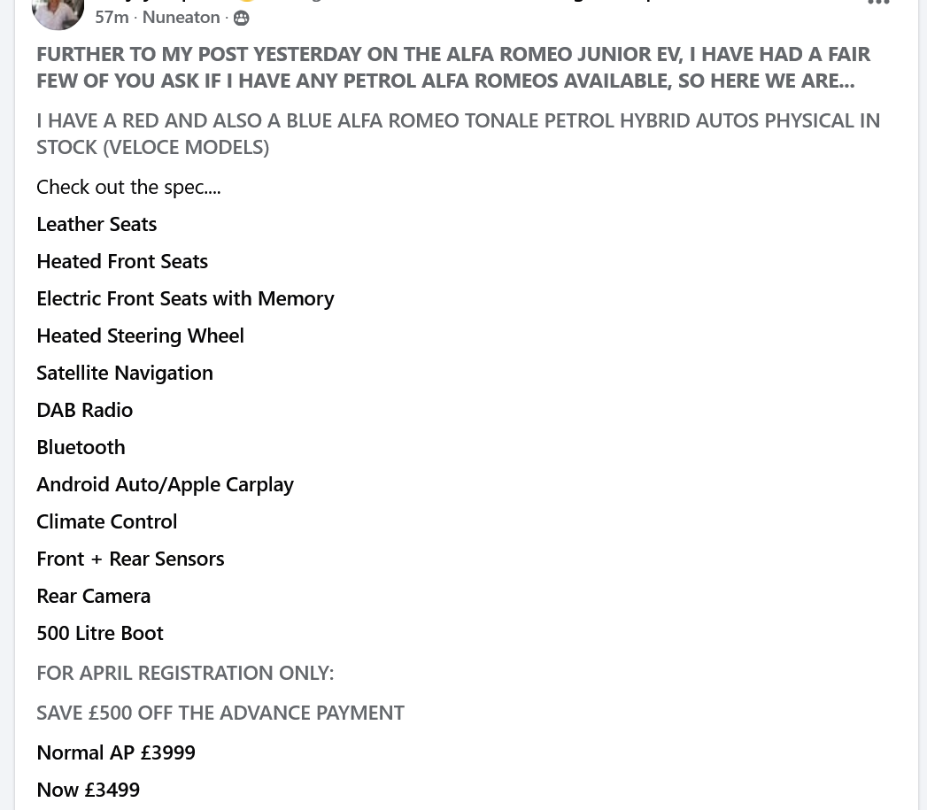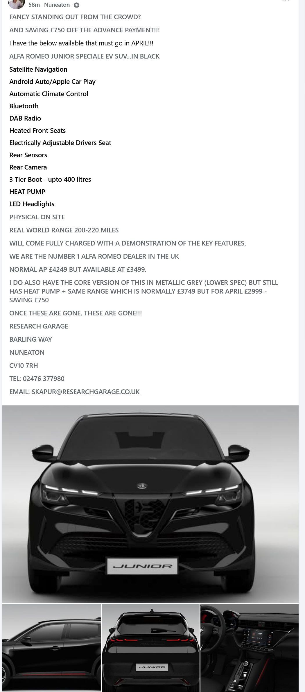 Via the usual fb groups posted today 23rd April 25, Research Garage Alfa Romeo in Nuneaton, Warwickshire are offering a £750 dealership contribution off the AP of stock Alfa Romeo Junior Special EV’s (normally AP £4249, now £3499) in black. Also the same offer on stock standard versions (normally £3749, now £2999) in grey. Limited stock for April 2025 registration Dealership contact is Sanjay.