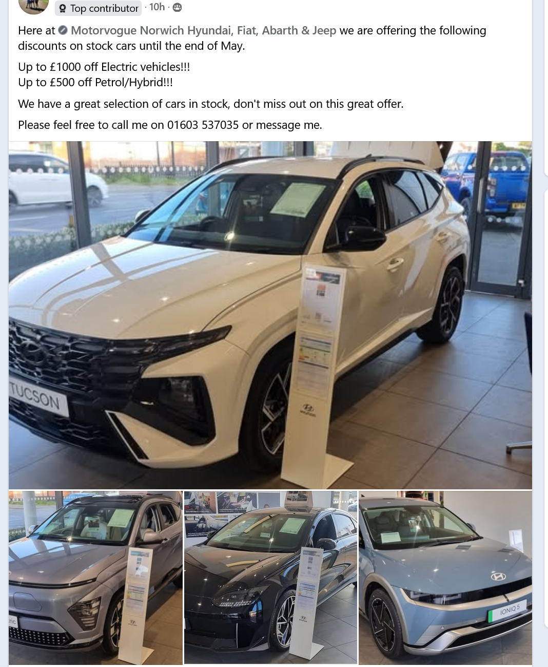 Via the usual fb groups posted yesterday evening 23rd April 25, Motorvogue in Norwich are offering stock Hyundai, Fiat, Abarth and Jeep models with upto £1000 off AP of EV’s and upto £500 off AP of petrol/hybrid models. ‘Great selection of stock’ according to the posted ad. Dealership contact is Sean: