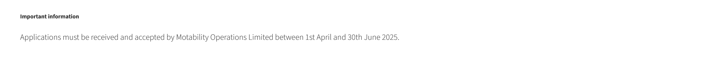 Applications must be received and accepted by Motability Operations Limited between 1st April and 30th June 2025.