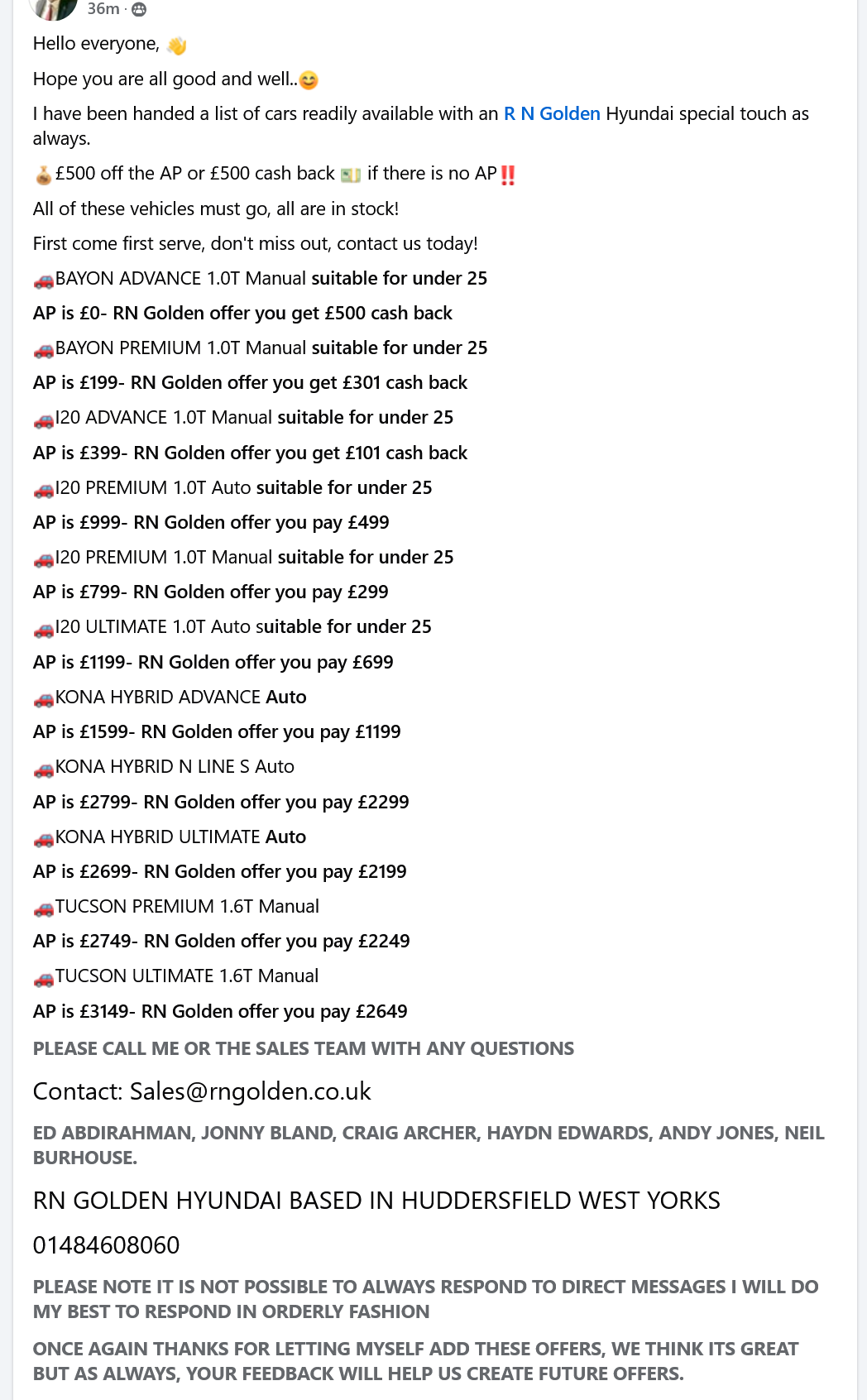 Via the usual fb groups, posted in the past hour today 24th April 25, RN Golden Hyundai in Huddersfield, West Yorkshire have the following stock with the following £500 off AP discounts and/or cashback.