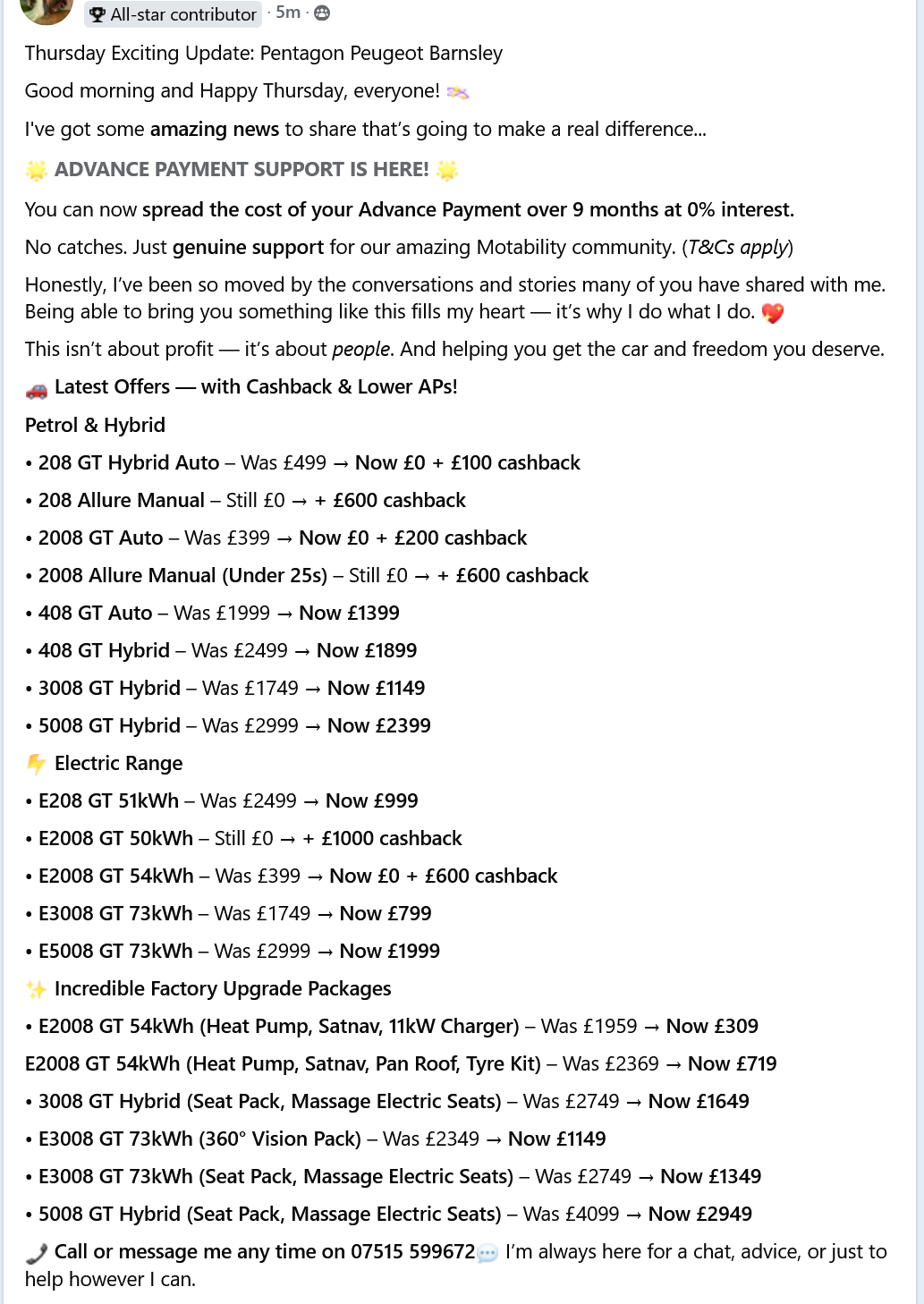 Via the usual fb groups posted today 24th April 25, and further to previous posted offer from this dealership (see #304368 on previous page), Pentagon Peugeot in Barnsley, South Yorkshire have further increased the discounts available on their electric range offers. Dealership contact is Tim.