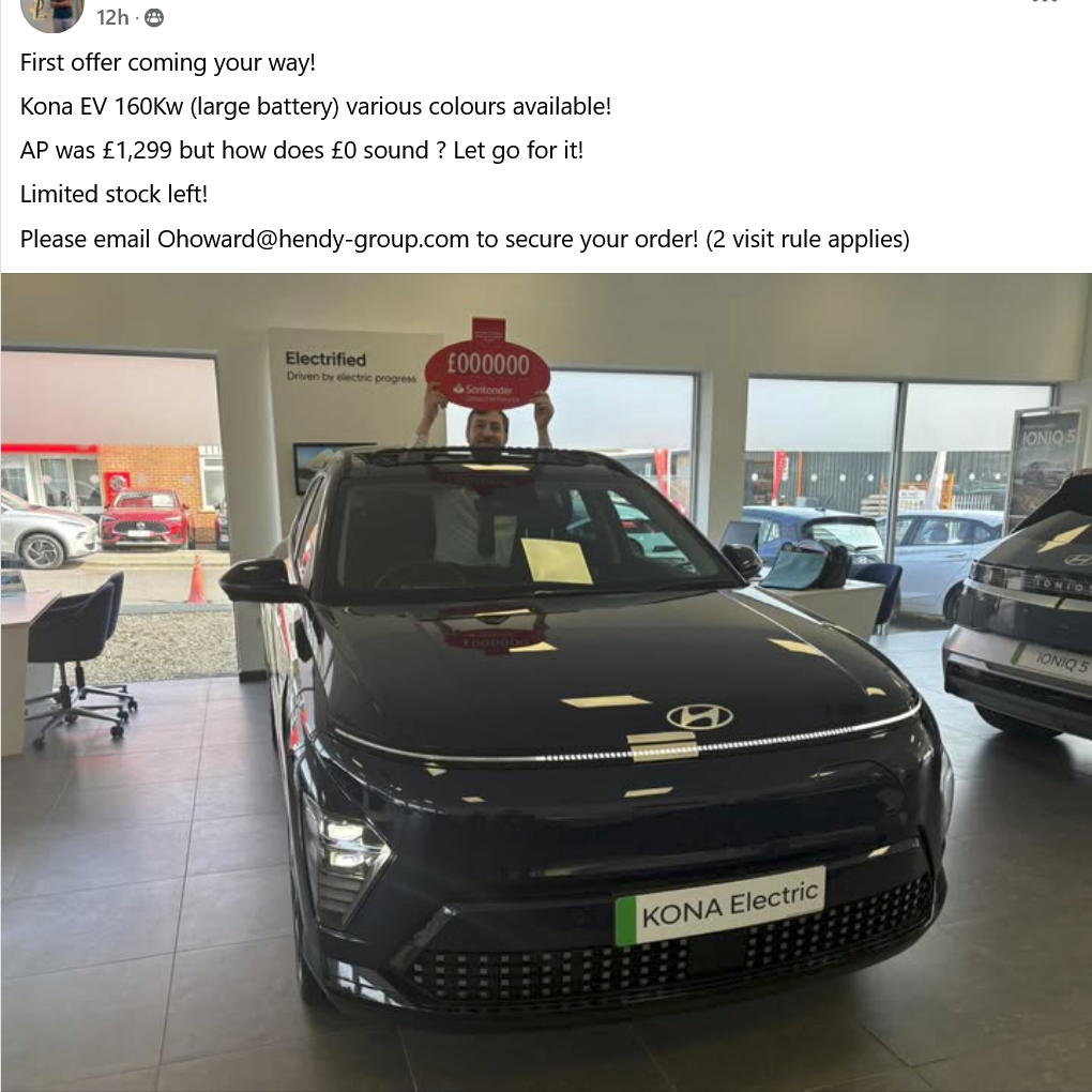 Via the usual fb groups posted yesterday evening 24th April 25, Hendy Hyundai in Poole, Dorset are offering stock Hyundai Kona EV 160kW with nil AP (normally £1299). Limited stock. Dealership contact is Oscar.