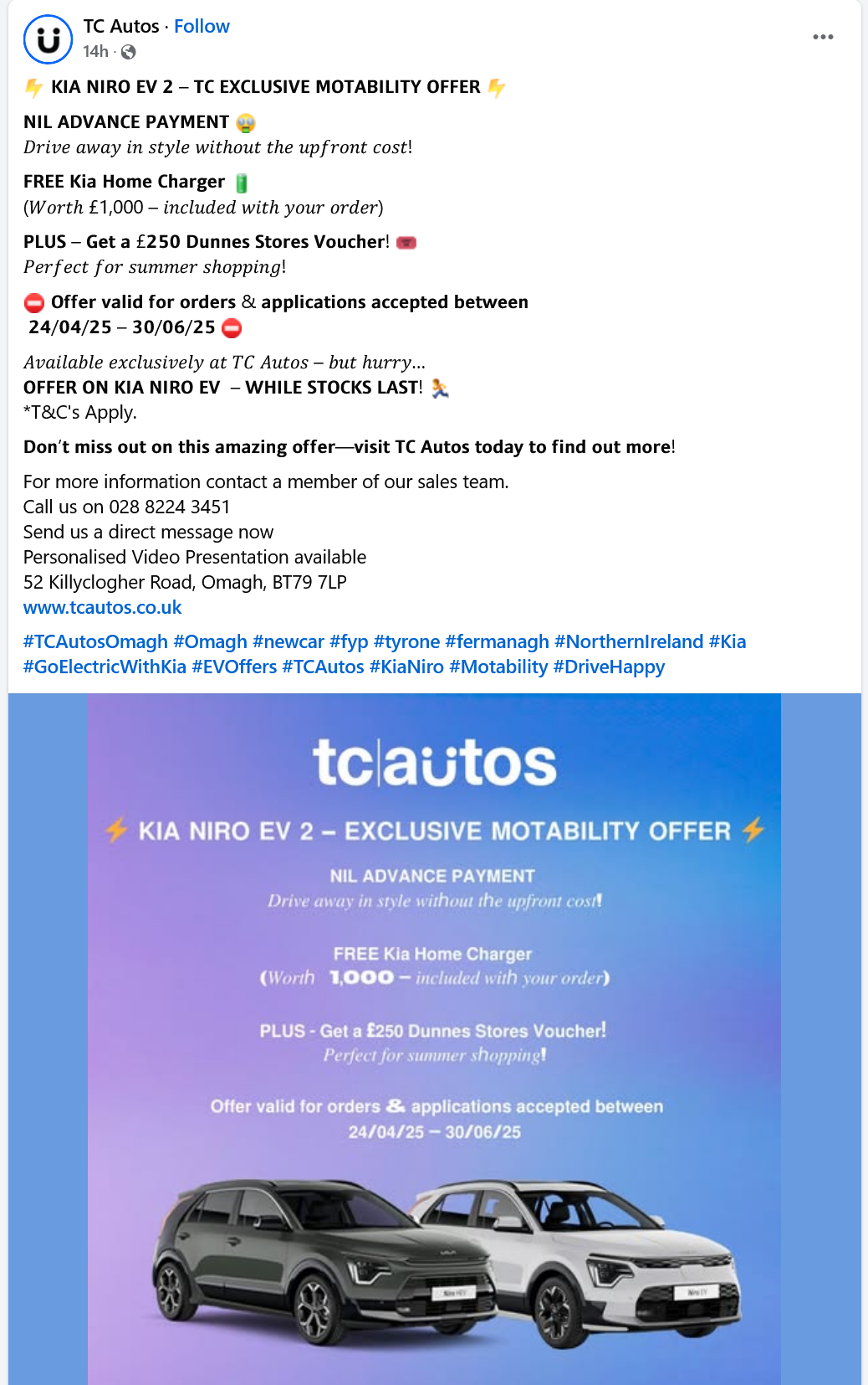 From the dealership fb page posted yesterday 24th April 25 and dealership website, TC Autos Kia in Omagh N.I. are offering a £250 Dunnes store voucher with the Kia Niro 2 EV. For orders/applications accepted on or before 30th June 2025 ‘while stocks last’.