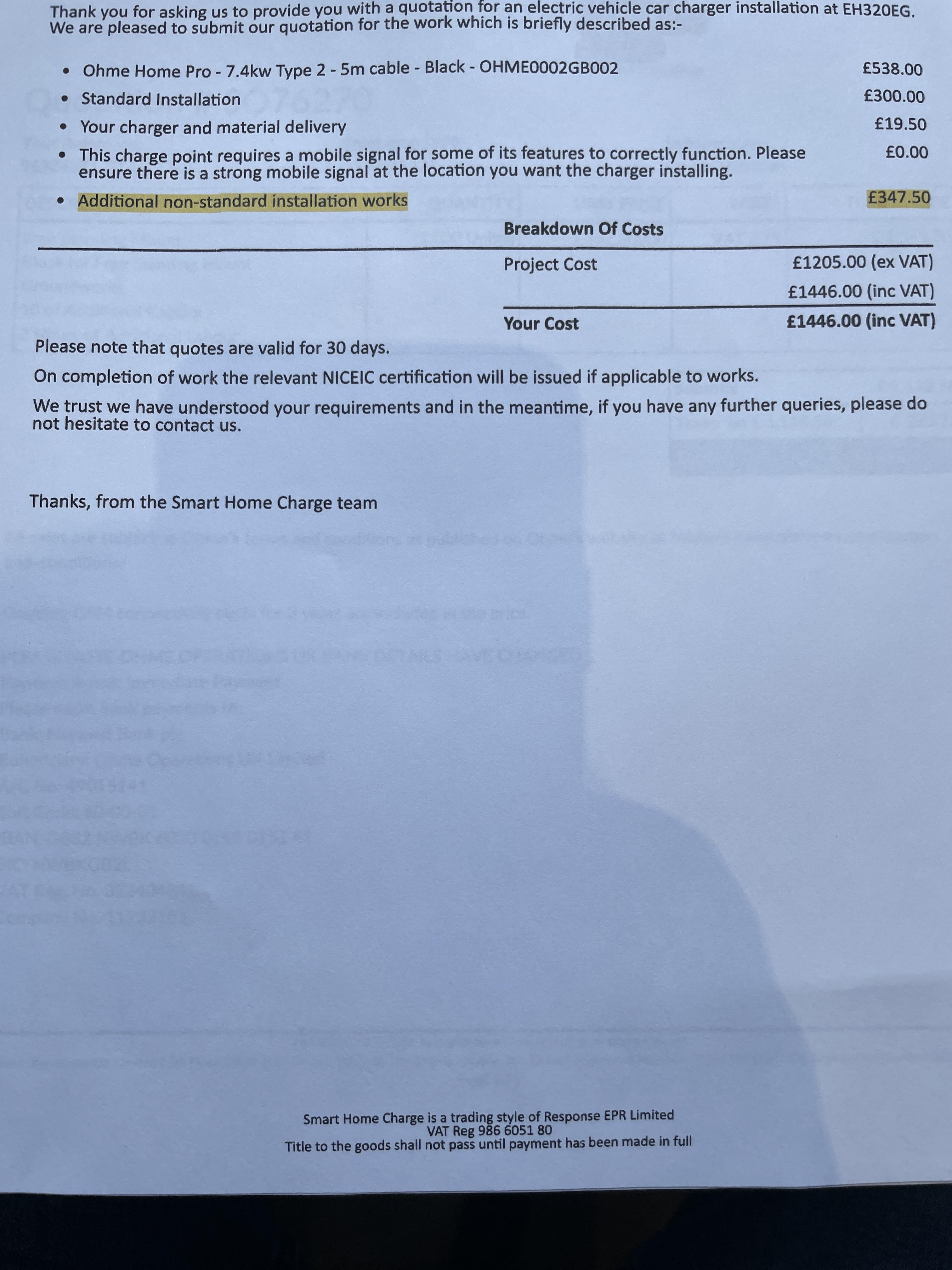 February 27, 2024 at 9:39 am #259563My husband obtained a quote this morning from a local EV installer and they quoted £1,446.00 including VAT. This included “Additional non-standard installation works” with post for £347.50 So, when compared to the OHME quote of £1,353.00, OHME have over quoted by £1,000.00.