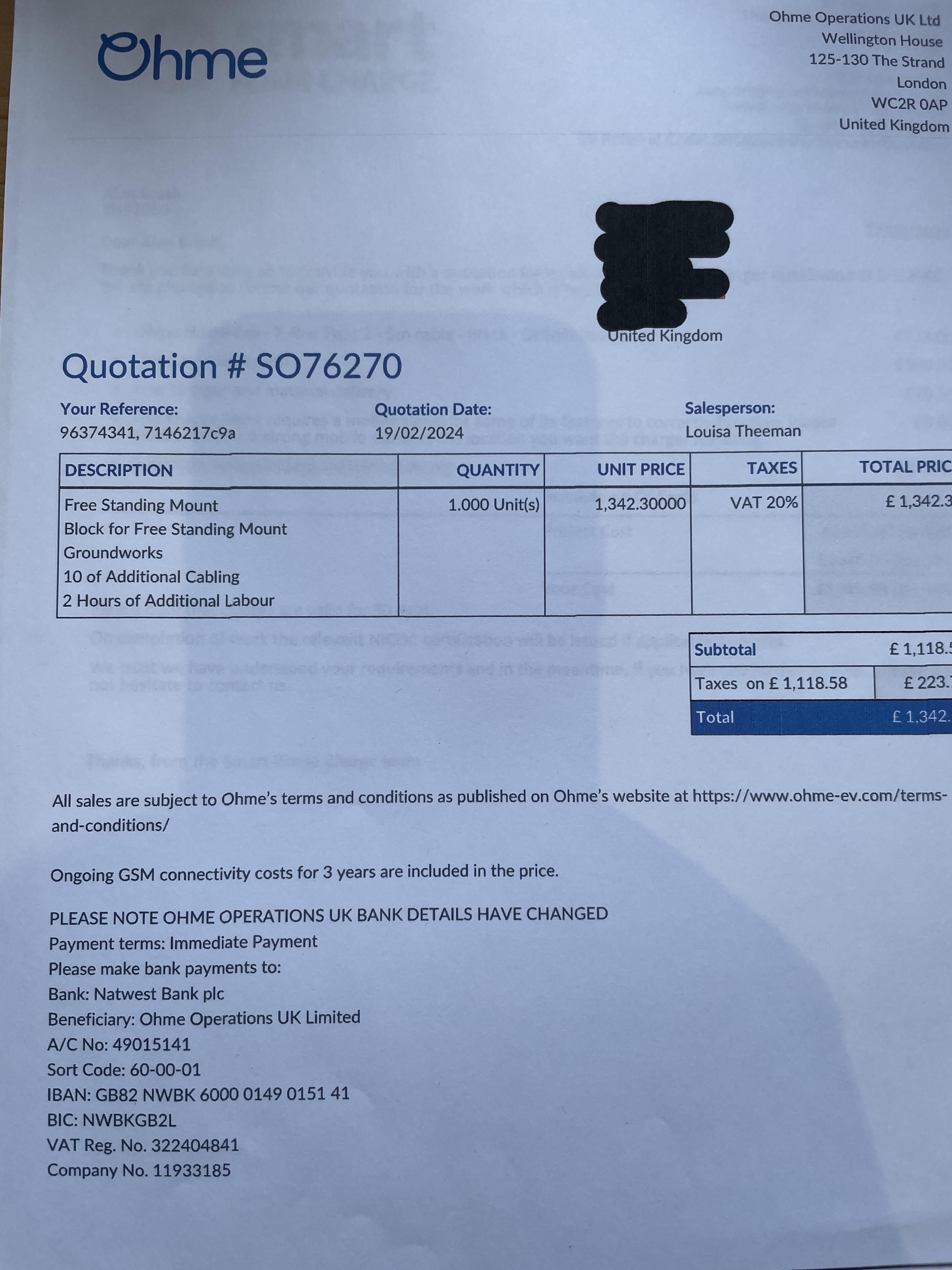 My quote from OHME was provided to them by: Smarter Utility Block 4 Unit 4 Fullwood Industrial Estate, Hamilton, ML3 9AZ Who are apparently OHME’s specialist for central Scotland, but 60 miles from me. I cannot understand why this installer was chosen, as there are dozens of EV installers in the Edinburgh/ East Lothian area.