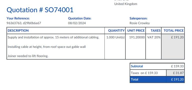 – Supply and installation of up to 15m additional cabling: £316.80 incVAT