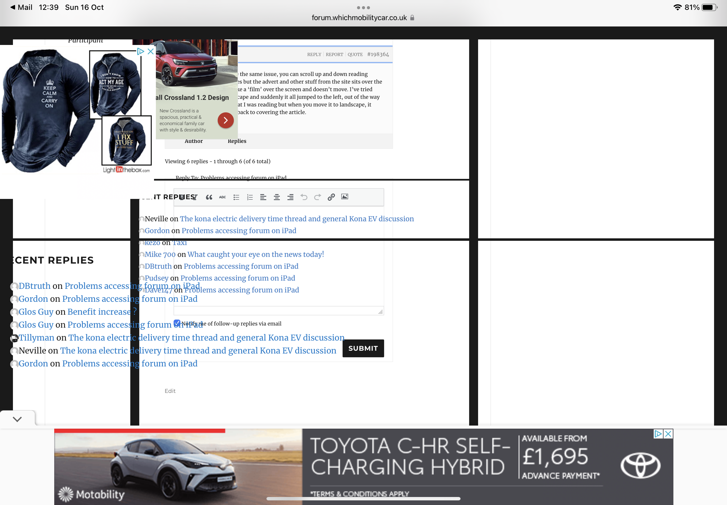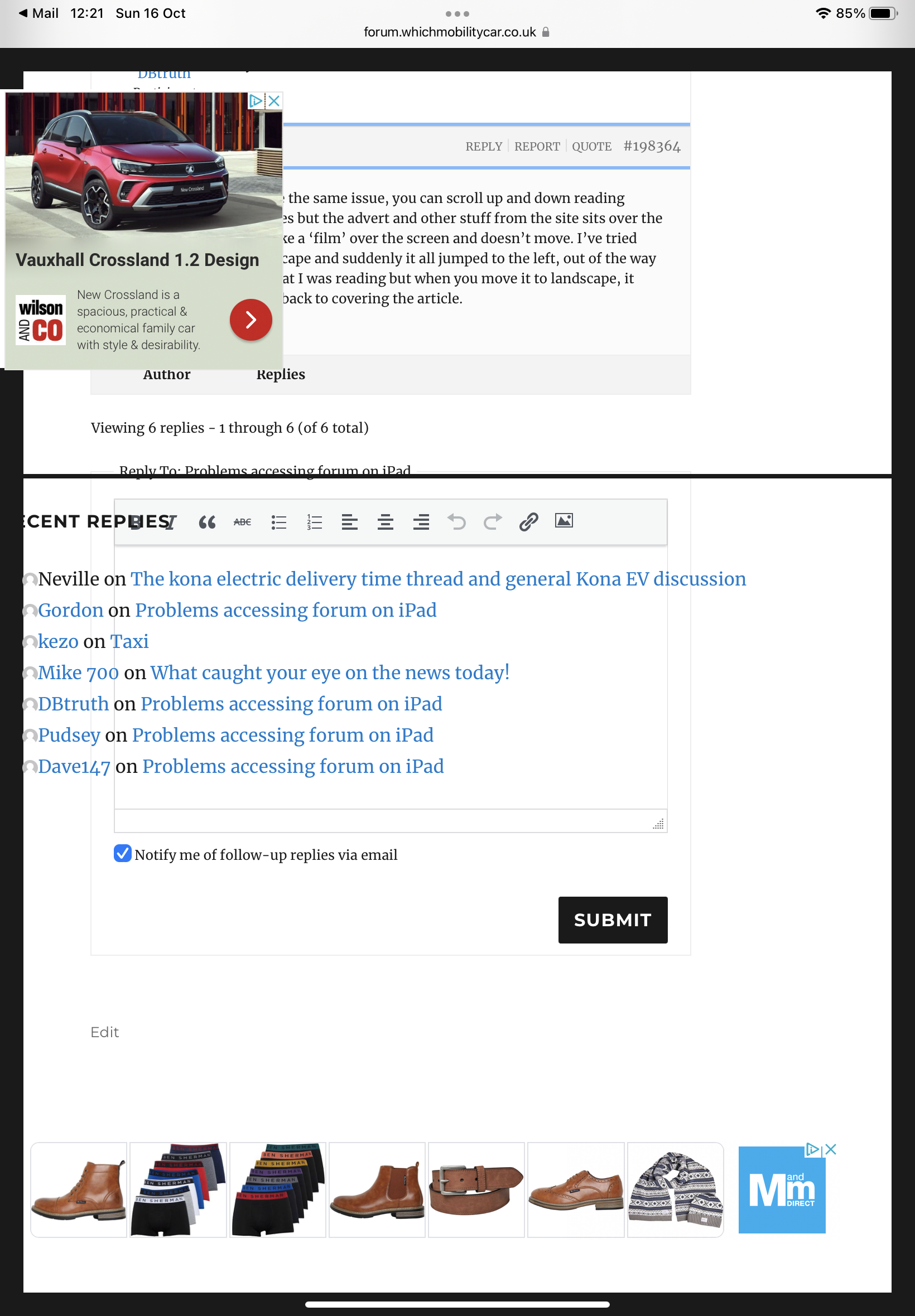@wmcforum Good morning. When accessing the forum I use an iPad. I have got used to the pop up adverts at the bottom of the screen and simply press the arrow to minimise them. In recent weeks, however, I am experiencing problems that are rendering the forum almost unusable. When scrolling down the screen (and in particular if I scroll back up again), the information that is normally in the right hand margin (adverts, recent replies etc) suddenly transposes over the left hand side of the main view (see attached photo). The only way to remove it is to scroll right back to the top of the page and start again, but as soon as you get so far down, or scroll upwards even slightly, it appears again. I’ve reset the iPad and still the same problem. Any thoughts? Thanks.