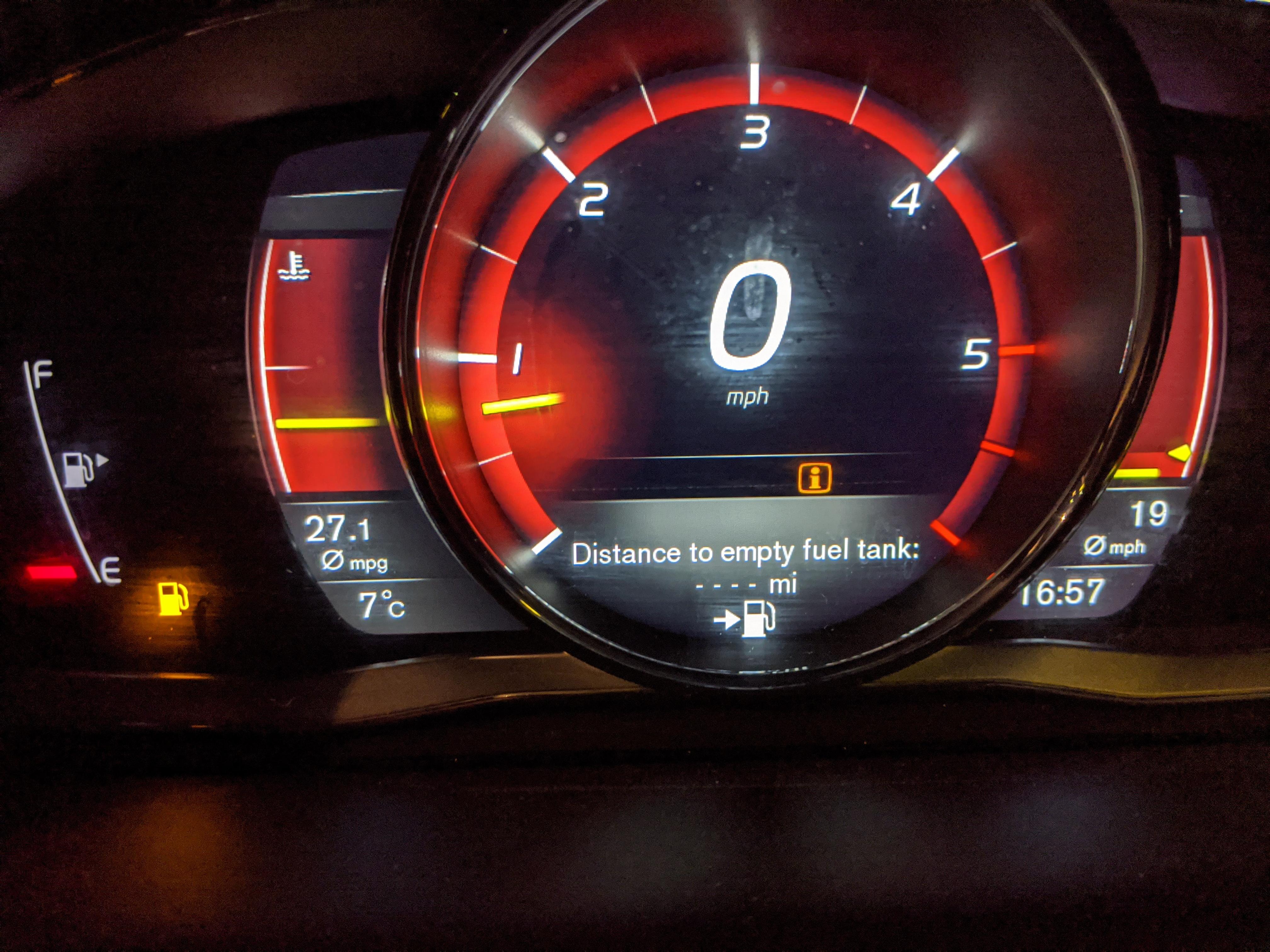 Colin, I have an XC60 also and after the 20 mile park, it once broke down right outside the petrol station. This was within 2 mins and half a mile after it came up. Maybe a fault? I no longer risk it…. I fill up to the brim when there’s 2 bars on the indicator (approx quarter of a tank)