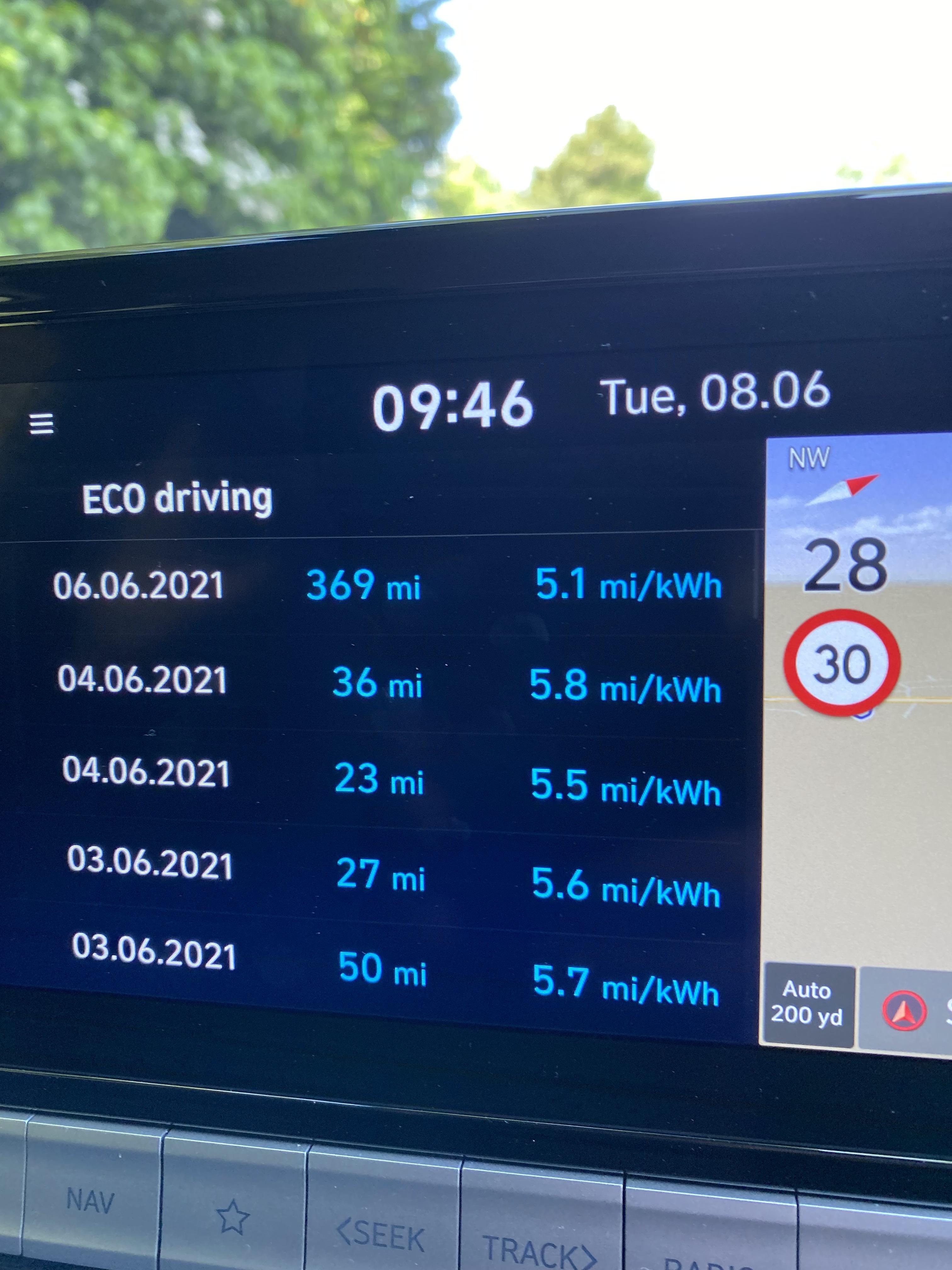 Most of my driving tends to be on A and B roads, so average speed is probably closer to 50mph, I’m averaging 4.7, so a range of 300, but in the really warm weather, I’m getting well over 5 miles a kW