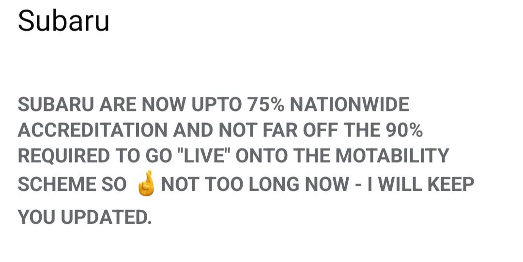 Wonder if the accreditation % is a Motability requirement or a Subaru operating decision?