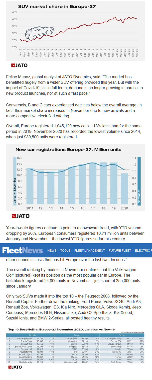 For the majority of the year, the market share of SUVs remained stable – between 40% to 41%. However, their registrations fell by 13% in November, and 21% YTD when compared to 2019.