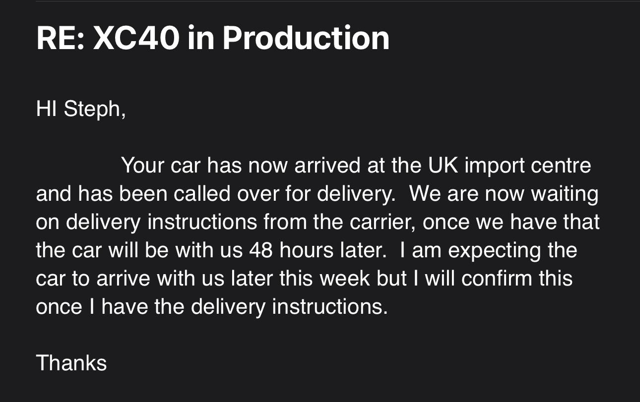 Got information on another XC40, exact same dealership (Edinburgh) – ordered 5 days later on 10th January. “Car Build date is the 13/06/2024 and the planned dealer delivery date is the 26/04/2024. Once the car arrives i will give you a call to organize a hand over date.” A telephone call corrected the delivery date to 26/6/24