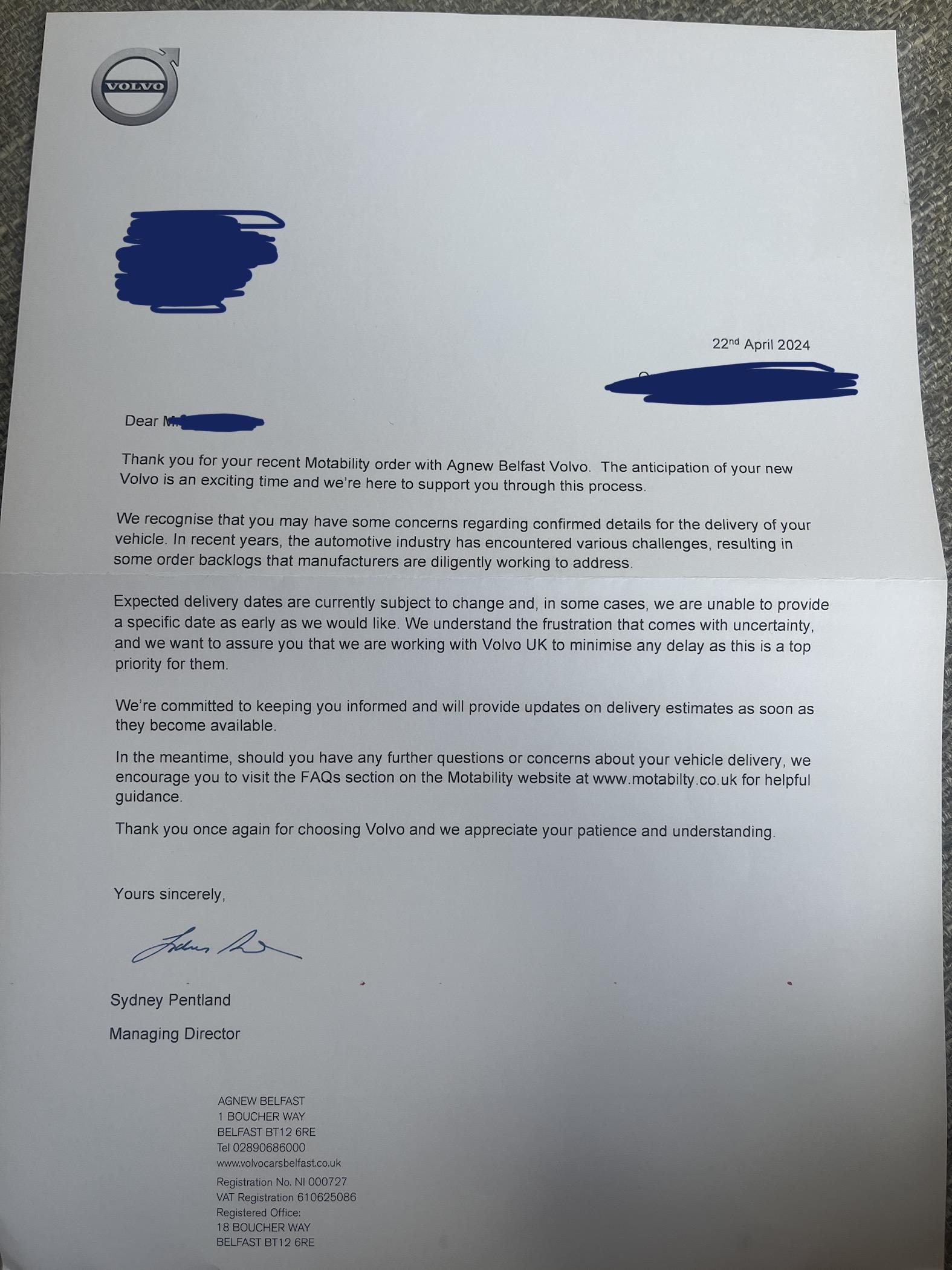 I got a long winded letter – that didn’t actually say anything of substance – in the post from Belfast Volvo yesterday. Will try come back here and post pic of it later but basically it said thanks for order, they are here to support during new car journey but that they can’t guarantee delivery times….so I strongly suspect (as we all have done) that my mid May delivery time is not happening….totally unprecedented to get a letter like that.