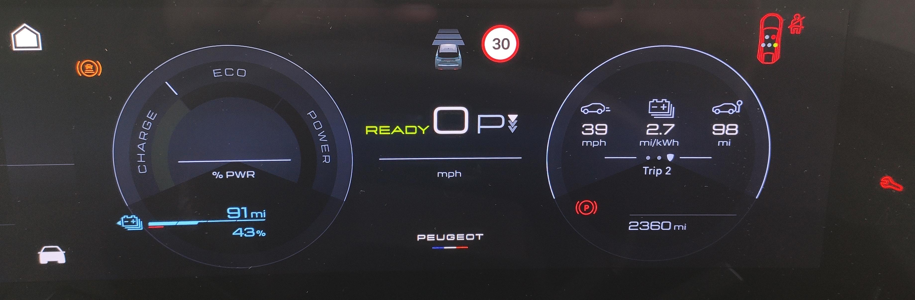 We get home and after travelling 98 actual miles the battery percentage had dropped to 43% and the guessometer had dropped from 327 miles to just 91 miles. (236 miles difference).