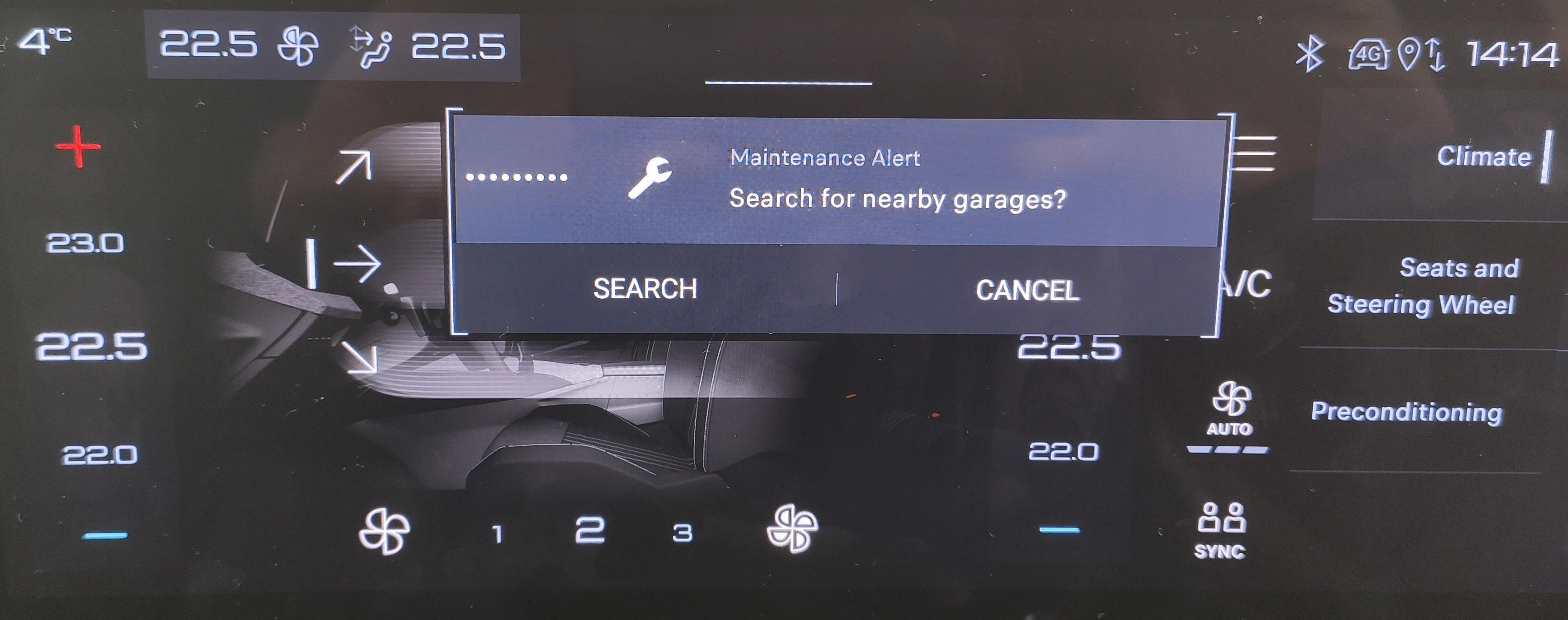Then 20 miles or so from home, a red spanner appeared and stayed on the right hand side of the screen, accompanied by a “maintenance alert” warning and asking if we wanted to search for a nearby garage!