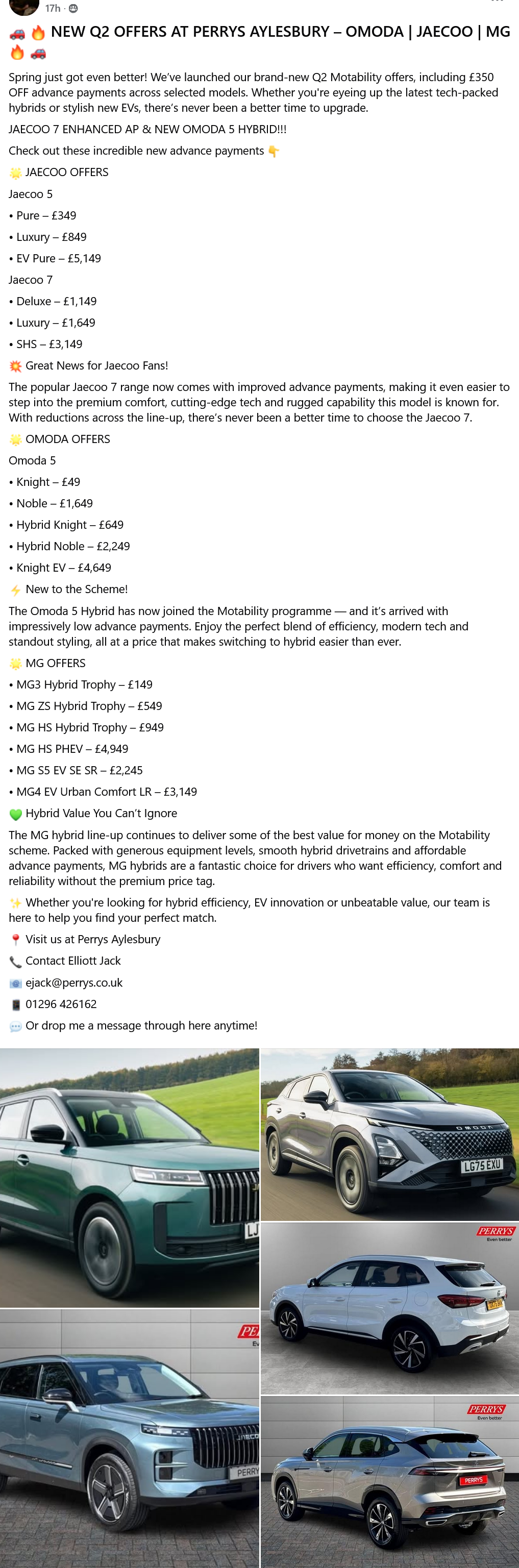 Via the usual fb groups posted yesterday 2nd April 26, Perry’s Jaecoo, Omoda and MG in Aylesbury, Buckinghamshire are offering various AP discounts of circa £350 off Jaecoo, Omoda and MG vehicles as listed below. Dealership contact is Elliott: