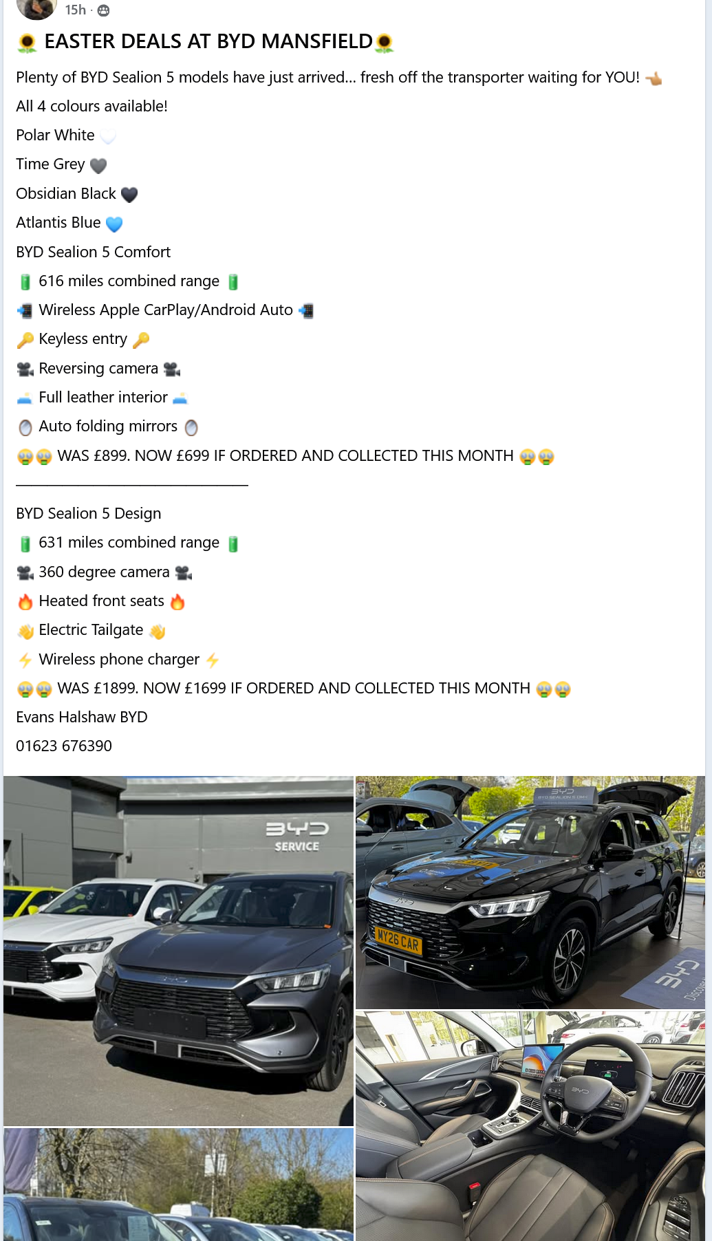 Via the usual fb groups posted yesterday 2nd April 26, Evans Halshaw BYD in Mansfield, Nottinghamshire are offering £200 off the BYD Sealion 5 Comfort & Design models. Easter Offer for April 26 delivery. Sealership contact is Sufian