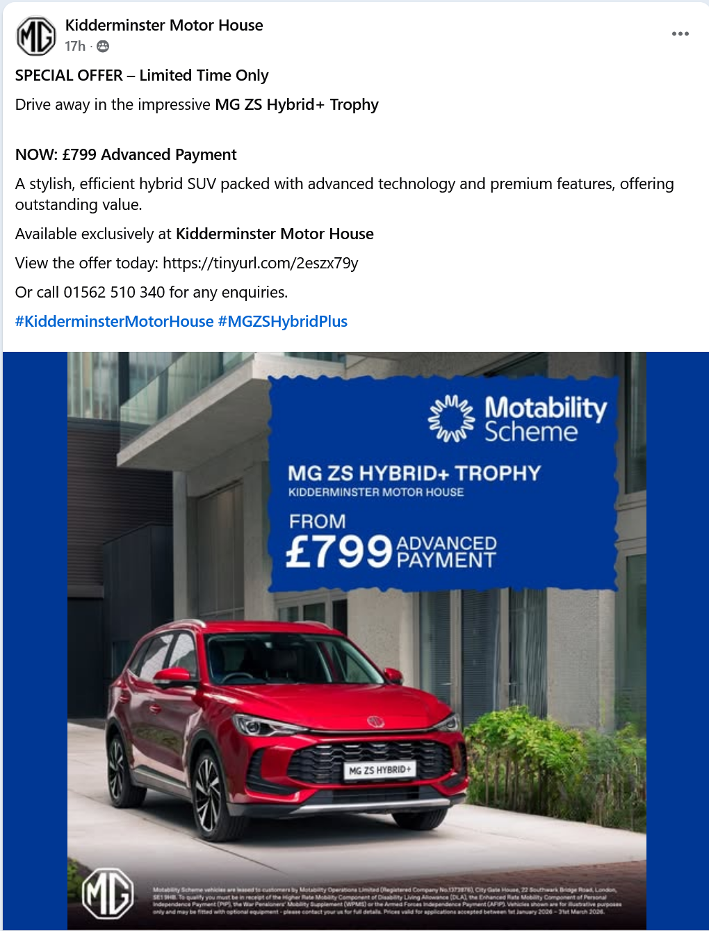 From the dealership’s fb page posted yesterday 4th April 26, Kidderminster Motor House MG in Kidderminster, Worcestershire are offering £100 off the AP of the MG ZS Hybrid Trophy (normal Q2 AP £899, now £799). For applications made by 30th June 26.