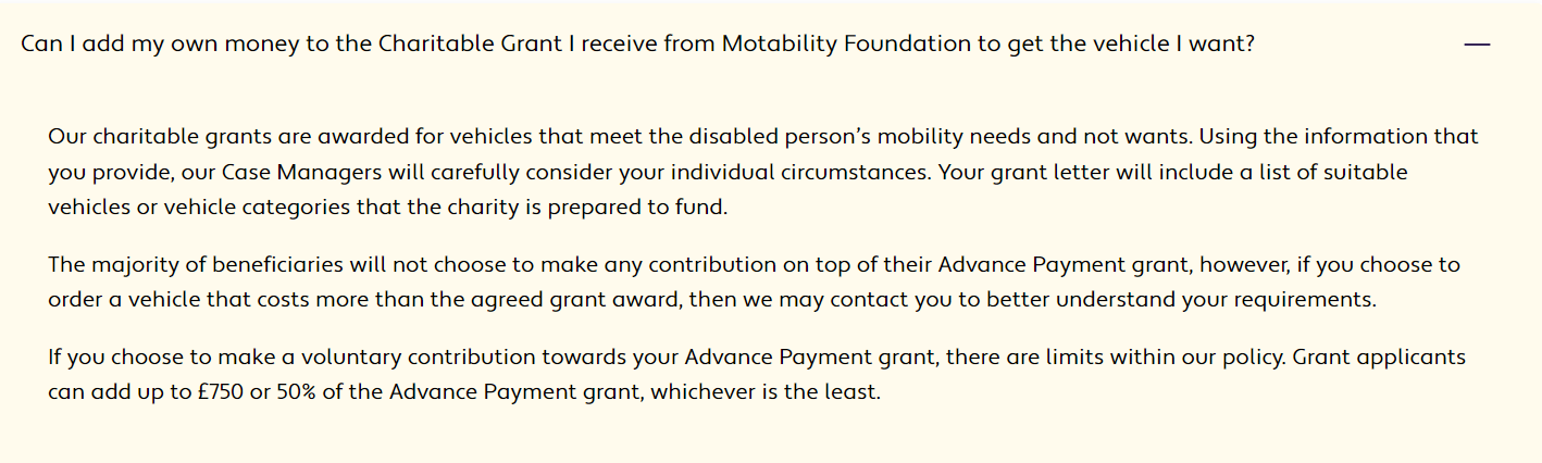 It used to be £750 or 50% of the grant amount, whichever was the least. Has that changed now because it still says the same on the Motability Foundation website.