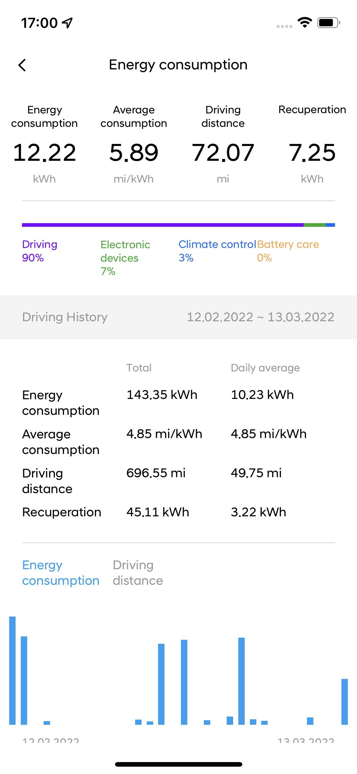 I always drive at legal speed limits and like to accelerate to these speeds quickly, do journeys using mixed road types, with car set in standard mode with low regen and auto climate control always on.